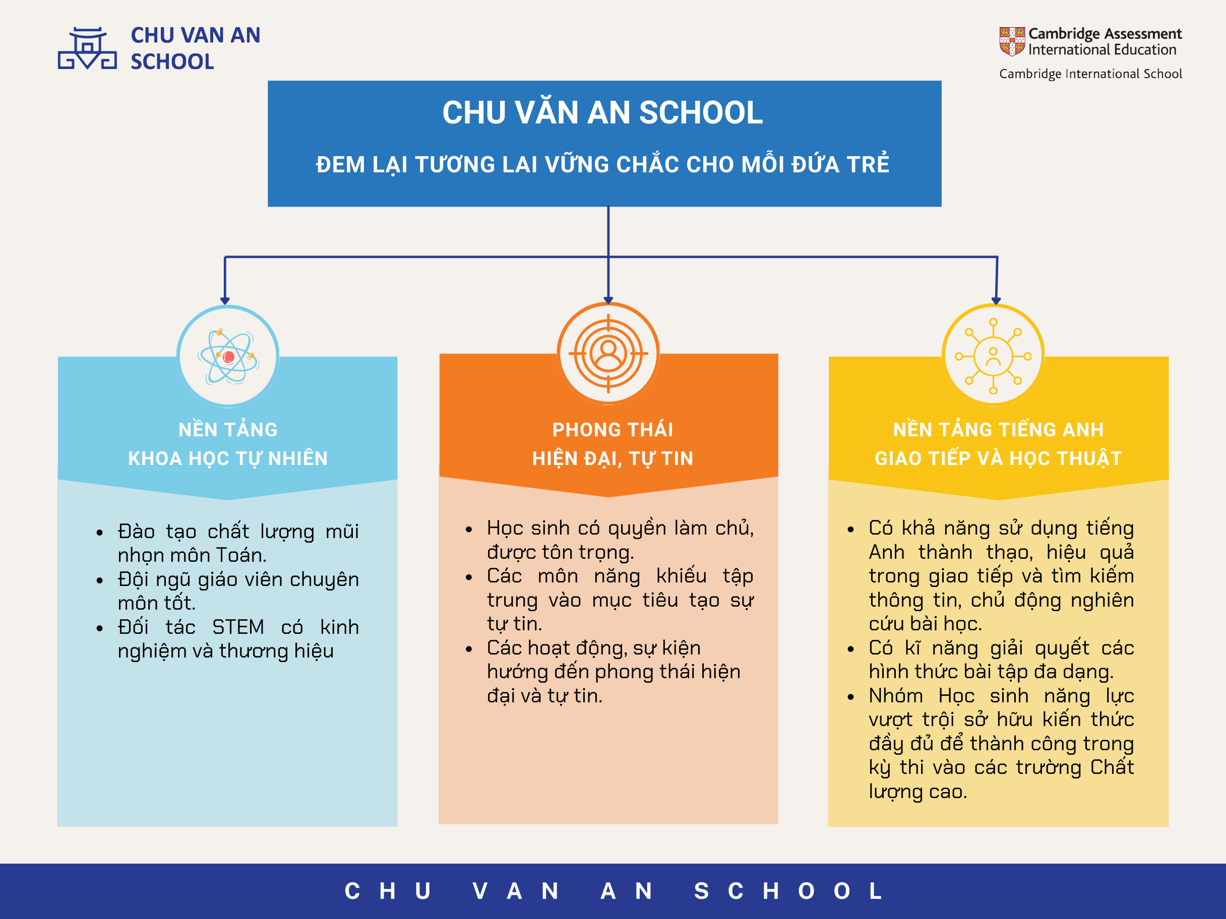 Chương trình học tập tại Chu Văn An School được xây dựng với mục tiêu trang bị cho học sinh nền tảng tốt nhất về kiến thức, kỹ năng và Tiếng Anh nổi trội để tự tin khám phá thế giới.