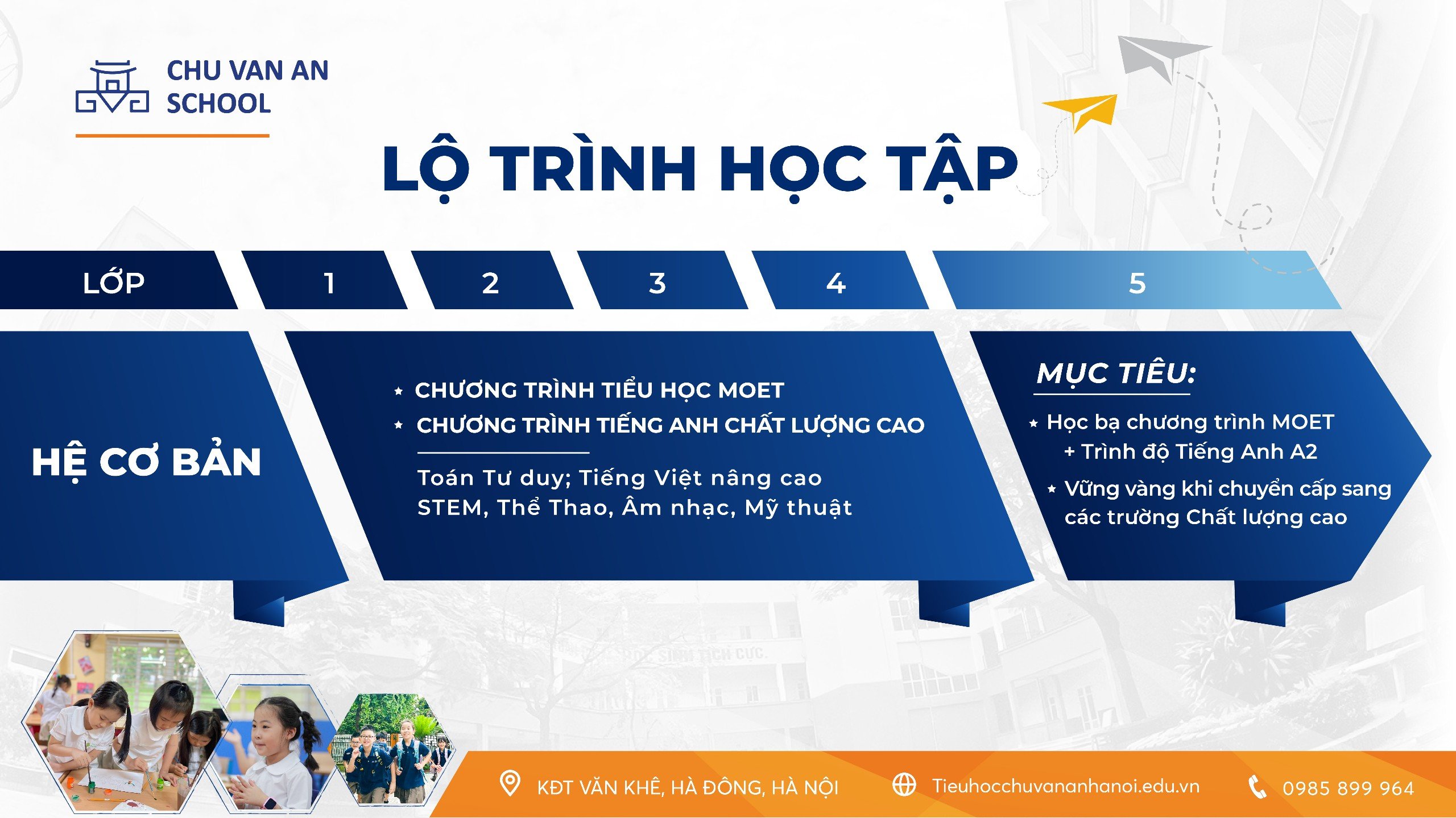 Theo đó, HỆ CƠ BẢN sẽ học theo Chương trình Giáo dục Quốc gia (MOET) do Bộ Giáo dục & Đào tạo Việt Nam quy định, tăng cường bộ môn Tiếng Anh, Toán tư duy và STEM. Nội dung cấu trúc chương trình học xuyên suốt từ lớp 1- lớp 5, tối ưu hóa theo hướng giúp học sinh nắm vững kiến thức trọng tâm của từng lớp, đủ khả năng đạt thành tích cao và các bằng cấp do Bộ Giáo dục & Đào tạo quy định.