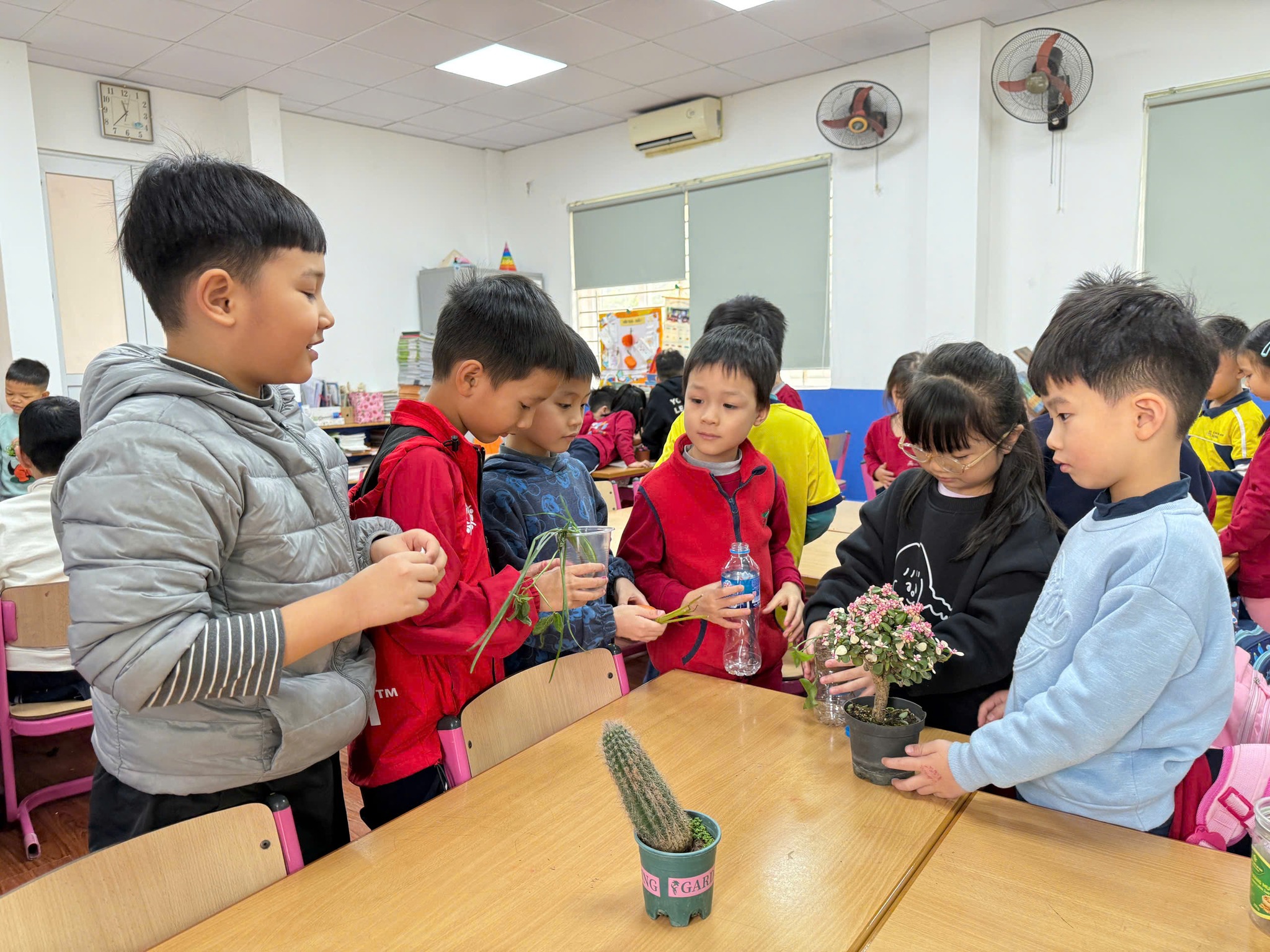 - Mang cây từ nhà: Mỗi bạn nhỏ mang đến lớp một loại cây yêu thích. Những “người bạn xanh” đặc biệt này có đủ mọi kích cỡ và hình dáng, từ cây to, cây nhỏ, cây có hoa đến cây chỉ có lá.